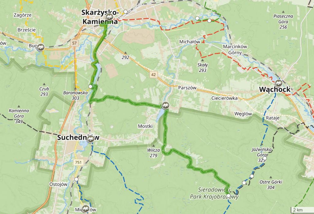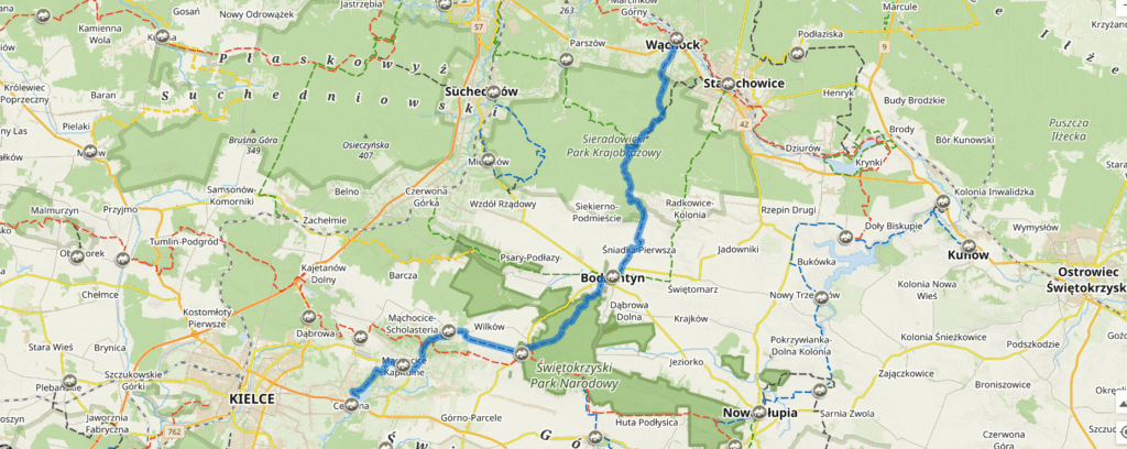 Przebieg szlaku: Skarżysko-Kamienna, PTTK, ul. Słowackiego 25 – Rejów – Suchedniów Płn PKP – Mostki – Kaczka – Wykus (połączenie za szlakiem niebieskim Wąchock –...