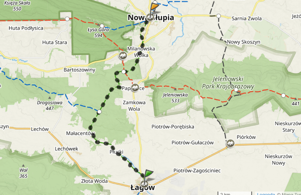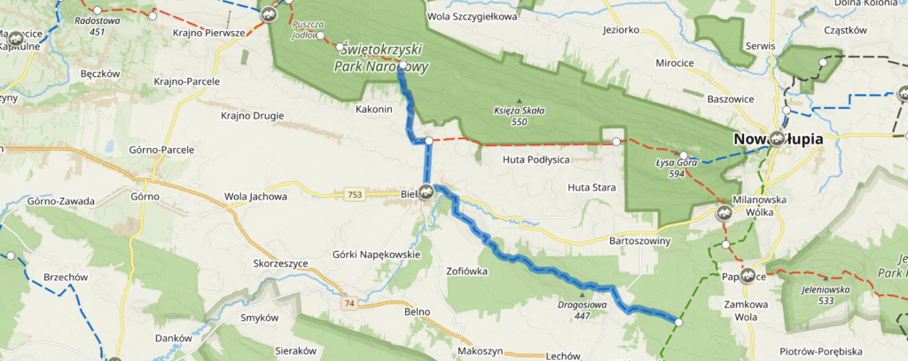 Przebieg szlaku: Wał Małacentowski (skrzyżowanie ze szlakiem zielonym Łagów – Nowa Słupia) – Lechówek  – Duża Skała – Bieliny – Podlesie (połączenie ze szlakiem czerwonym...