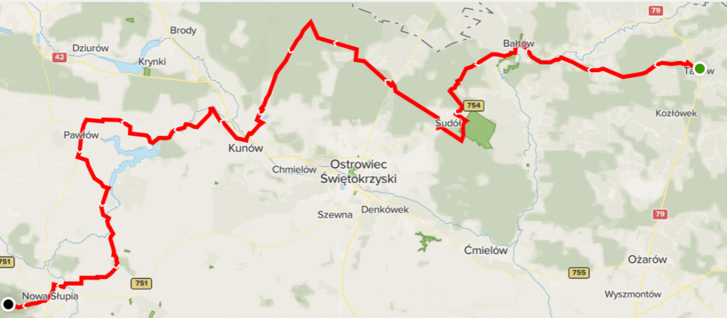 Przebieg szlaku: Tarłów, rynek, przystanek – Wólka Pętkowska, węzel szlaków – Bałtów, młyn  – Bałtów, pałac– Krzemionki – Sudów, węzeł szlaków – Dębowa Wola –...