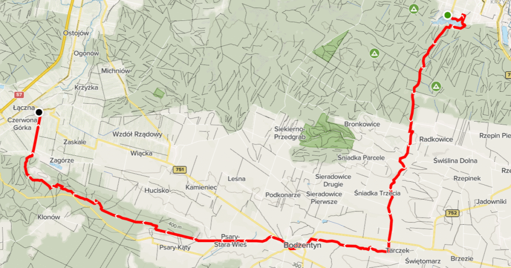Przebieg szlaku: Starachowice PKP – Bronkowice – Radkowice  – Tarczek  – Bodzentyn  – Psary Stara Wieś  – Bukowa Góra (początek szlaku żółtego)  – Łączna PKP...
