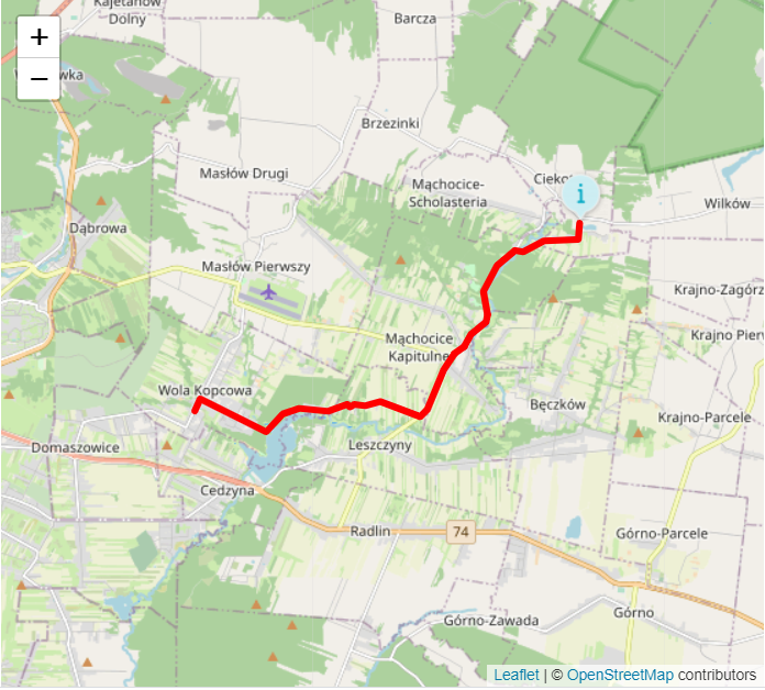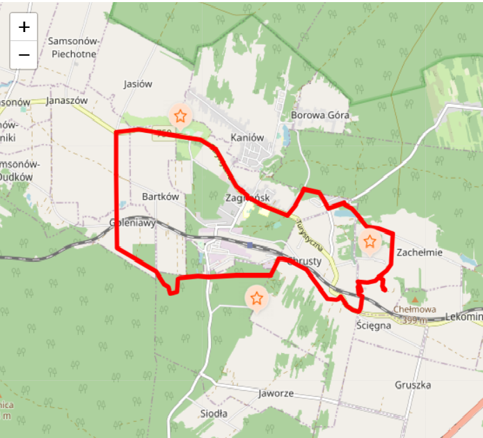 Długość szlaku wynosi ok. 12 km. Początek znajduje się na parkingu przy pawilonach, skąd drogą wojewódzką jedziemy w stronę Samsonowa. Po prawej stronie mijamy Dęba „Bartka”....